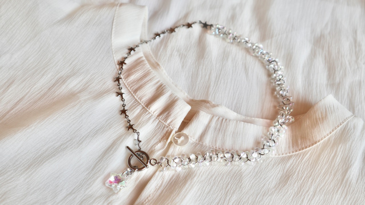 ガラスビーズを一つ一つ繋ぎ合わせたネックレス。